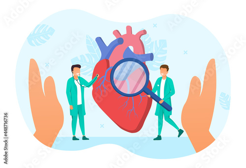 Two male cardiology doctors are examining human heart with magnifier and stethoscope. Concept of heart treatment and healing with professional nurse and doctors. Flat cartoon vector illustration