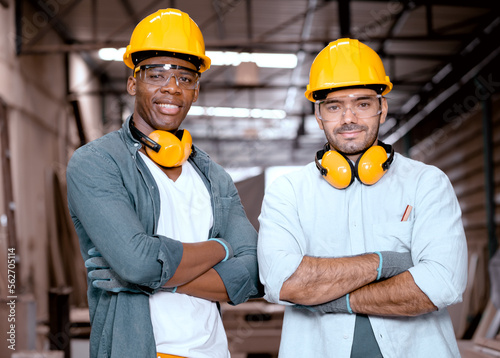 Two male carpenters work in carpentry workshop. Diverse ethnic men at work in wood furniture building factory. Multiracial joiner man and craftsman worker standing together in woodwork manufacturing.