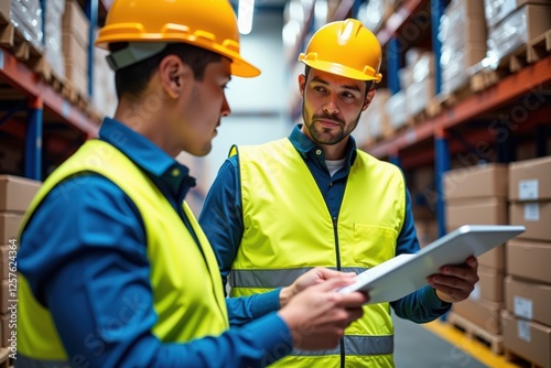Two male construction workers in a warehouse discussing project details while reviewing a clipboard, showcasing teamwork and safety in logistics operations.