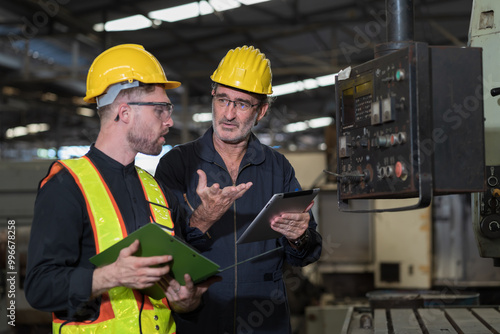 Two male engineer checking, repair, maintenance CNC machine in factory. Group of male technician working with CNC machine during manufacturing process