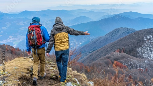 Two Male Hikers Enjoying Scenic Mountain View Pointing into the Distance, Adventure Travel Concept