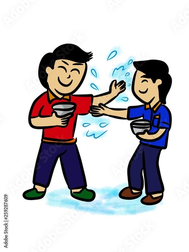 Two man splash water in songkran day - kid drawing