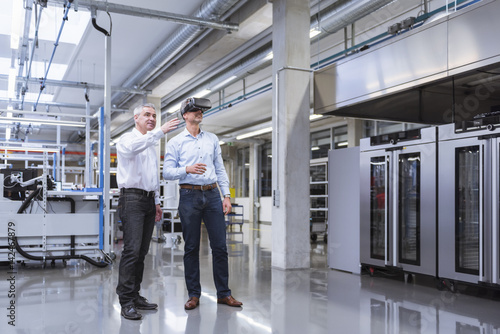 Two managers standing in company, using VR goggles