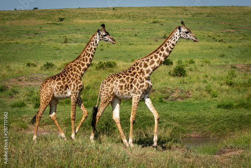 Two Masai giraffe cross savannah in sunshine