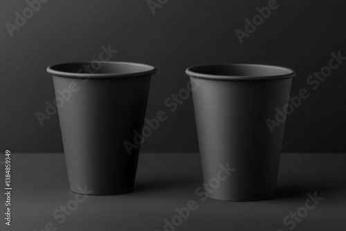 Two matte black paper cups on dark background with minimalist aesthetic and clean surface.