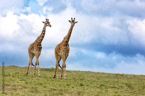 Two mature male Masai giraffe, Giraffa tippelskirchi, against a summer sky. Masai Mara, Kenya.