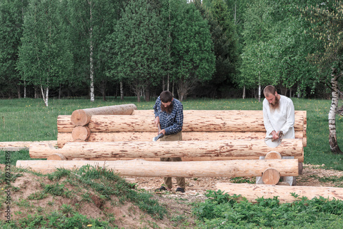 Two men are building a wooden house from logs in nature, cutting logs with axes, logs in the foreground, construction, village, summer, greenery, forest, summer.