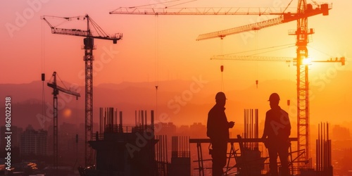 Two men confidently stand atop a construction site, overseeing the progress and ensuring safety.