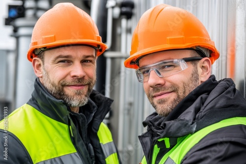 Two men engineer talking in modern factory Production line machine and setting it for work
