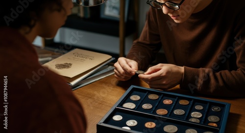 Two men examining collectible coins in wooden box on table