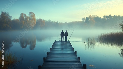 two men fishing on a pier at a calm lake early in the morning with nets and rods reflecting the beauty of nature and peaceful surroundings during a quiet outdoor adventure