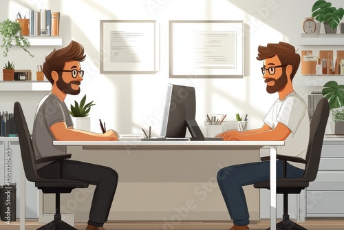 Two men in a modern office engaged in a professional conversation during daylight hours