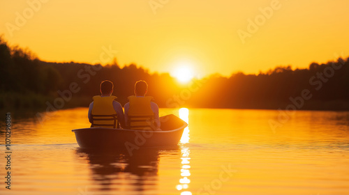 Two men in life jackets are peacefully boating on a calm lake at sunset