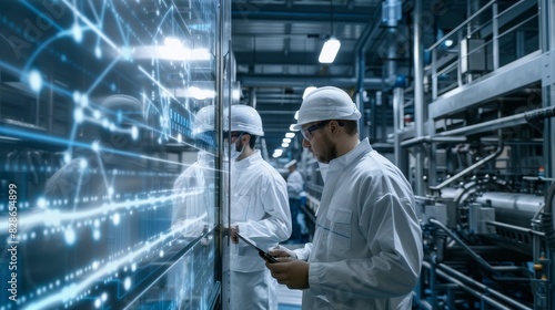Two men in white lab coats are looking at a computer screen with a lot of lines