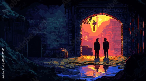 Two Men Silhouette under Archway in Dark Pixelated Cityscape with Vibrant Light