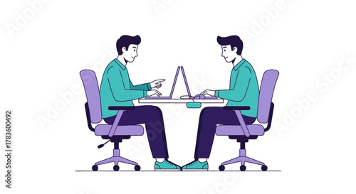 Two men sitting at a table with laptops, collaborating on a project.