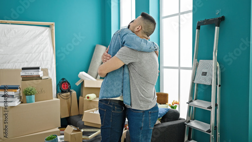 Two men smiling confident hugging each other at new home