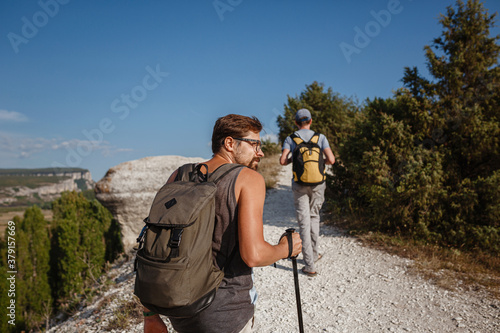 Two Men walking on rocky slope carrying Backpacks using trekking Sticks.