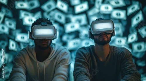 Two men wearing virtual reality headsets are sitting next to each other. Generative AI