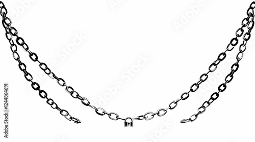 Two Metal Chains Connected by a Padlock Hang Loosely Against a White Backdrop