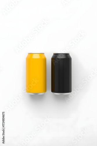 Two metallic beverage cans in black and yellow color standing side by side on clean white background, minimalist mockup design for branding, packaging, advertising and product presentation