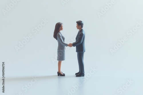 Two miniature businesspeople shaking hands, symbolizing partnership, collaboration, and agreement.