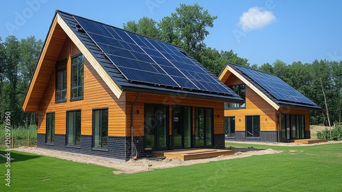 Two modern houses with solar panels surrounded by greenery on a sunny day.