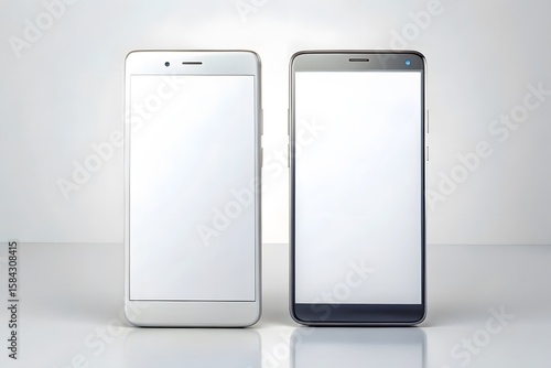 Two modern smartphones with blank white screens displayed side by side on a reflective surface