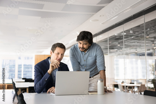 Two multinational male colleagues using laptop in coworking office, review new platform, brainstorm ideas, generate creative solutions or business strategies, working on task or online presentation