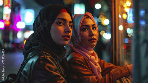 Two Muslim women wearing headscarves pose in front of a shop window in the middle of the street at night