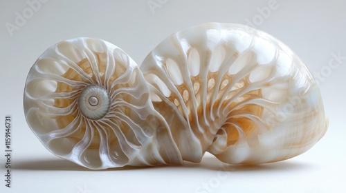 Two nautilus shells, intricately detailed, showcasing spiral chambers and pearly interior.