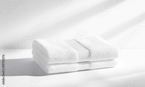 Two neatly folded white terry towels stacked on a white surface with soft shadows. Clean and fresh concept.
