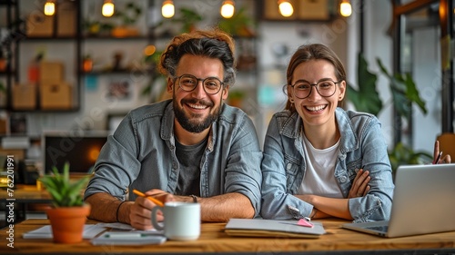 Two office employees are seated at desks, grinning and content.At the contemporary workplace, two businesspeople are seated at desks and grinning broadly.