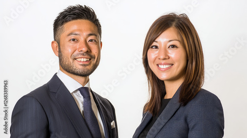 Two office workers, one male and one female, smiling at the camera while wearing business suits, generative AI