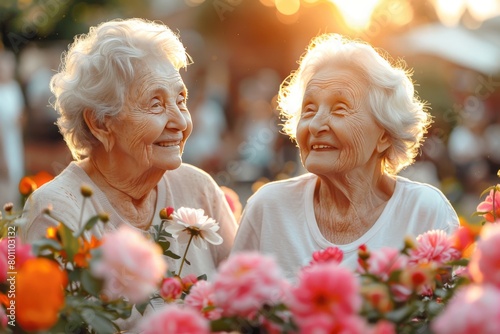 Two Older Women Sitting in a Field of Flowers