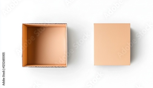 Two open empty cardboard boxes on white background, top view, neutral color palette, simple and clean design