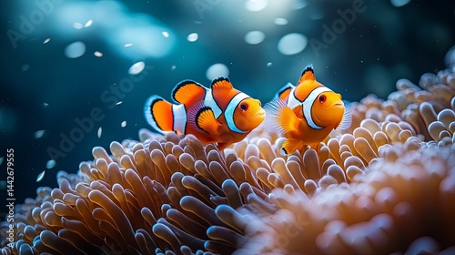 Two orange and white fish resting near coral.