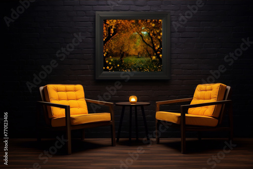 Two orange armchairs in a dark brick room with a framed painting of an autumn forest on the wall behind them and a small round table with a candle between them.