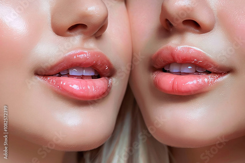 Two pairs of lips are shown in close-up. The lips look moisturized and shiny, with a slight pink tinge. The skin around the lips is smooth and light, with a slight blush