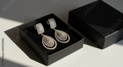 Two pairs of luxurious diamond earrings rest inside a sleek black gift box. The earrings feature a rectangular top and cascading teardrop design. Sunlight enhances their sparkle.