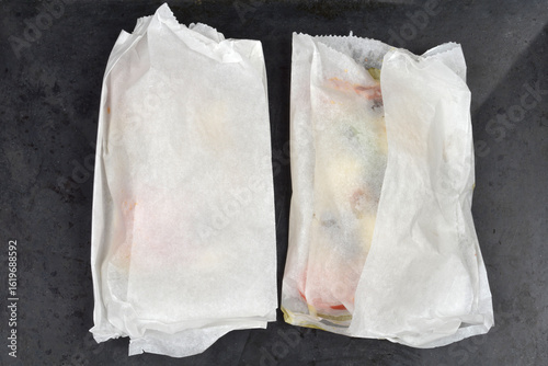 Two parchment paper packets, containing a tofu dish, are ready for baking on a dark baking pan