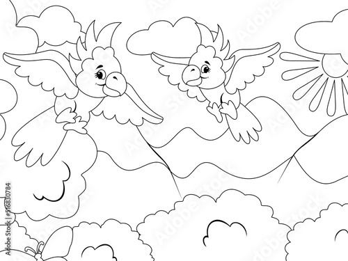 Two parrots are flying in the sky. Raster, page for printable children coloring book.