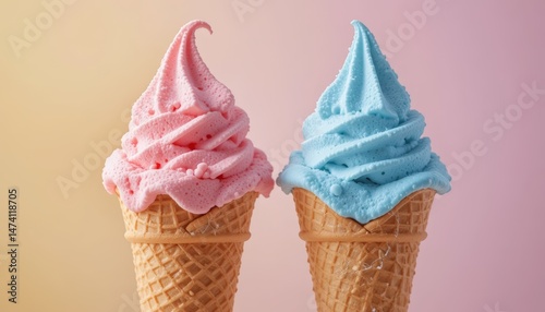 Two pastel-colored ice cream cones, one pink and one blue, set against a soft background, ideal for gender reveal parties, summer celebrations, or ice cream branding.