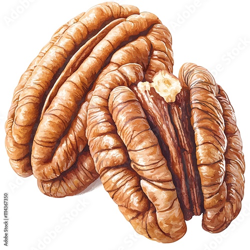 Two Pecan Nuts in Watercolor Style, Isolated on White Background.