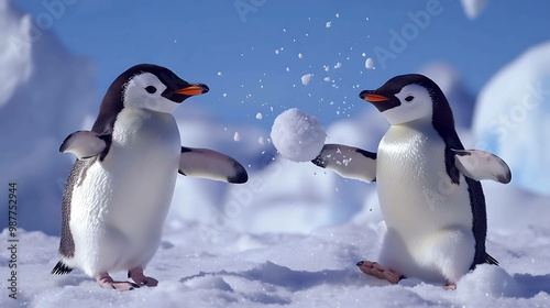 Two penguins playing with a snowball.