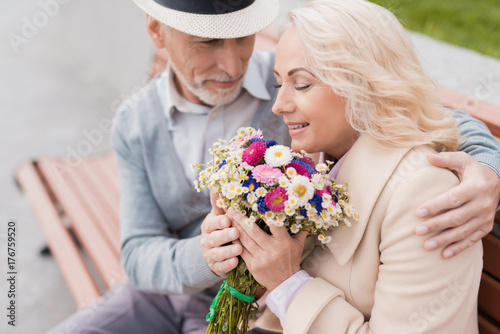 Two pensioners are sitting on a bench in the alley. The aged man gave the woman flowers. He holds her hand
