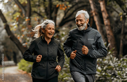 Two people, a man and a woman, are jogging side by side on a path outdoors