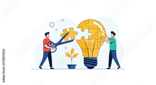 Two people are working together to build an idea with puzzle pieces and a lightbulb.