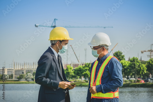 Two people Businessman talking with senior on site construction about real estate plant project and Business project