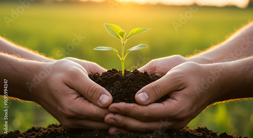 Two people carefully holding a young green plant in rich soil, symbolizing growth, new beginnings, and environmental care